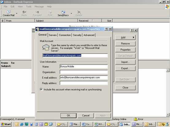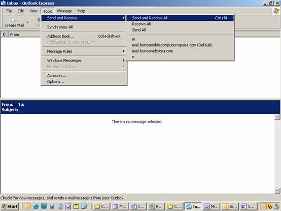 Bonza will have given you. Under the Password, click to put a tick in the "checkbox" Remember password. Now click Next> Beauty! You're being congratulated by a machine! Click Finish then Close. You're now back at the standard Outlook Express screen. Let's try this baby out, eh? Click Tools, then, at the top of the list, Send/Receive and, from the "fly out" Send/Receive All. See it in the screen shot below. If you receive no error, you've set up the email address correctly. Bonzawebsites will have sent a test message for you to receive. That proves incoming mail works. Reply to the email to prove outgoing mail works too. |