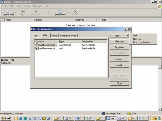 (second from the bottom of the list of commands). The screenshot below is LIKE what you'll be looking at. Be sure to "select" the Mail "tab" (between All and News). A lot of the mystery surrounding email will disappear if you understand this quirky little bit of information about it: Outgoing mail is sent via your Internet Service Provider (ISP). It'll be someone like Bigpond. ISPs use SMTP (Standard Mail Transfer Protocol). Incoming mail is received via your Domain which Bonza provides. We use POP3. (Post Office Protocol). In the illustration below, I single left clicked in the Account column mail.bonzawebsites.com. Now, at the right of the "dialogue box" is a list of commands, click on the command third from the top Properties. |