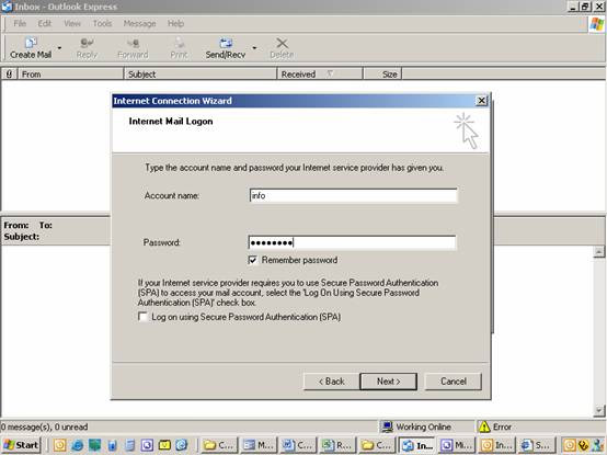 with the first field, it's already correctly completed with POP3. The Incoming mail field is to be completed with the information which Bonza will have given you. (It'll be something LIKE mail.yourdomain.com). The Outgoing mail (SMTP) server: information is the information you wrote down. You're a legend. Please click Next> This is what you'll see: |